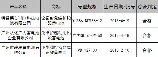 2013年廣州市蓄電池產(chǎn)品質(zhì)量監(jiān)督抽查合格產(chǎn)品及其企業(yè)名單