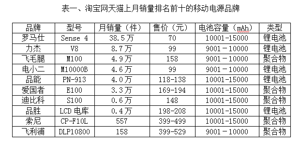 大智慧通訊社對天貓上各品牌不同型號的移動電源月銷量統計發現,低價大容量的移動電源銷量排名總體靠前,羅馬仕Sense 4的移動電源憑借70元/臺的價格低價優勢,其月銷量達38.5萬,博得排名桂冠。