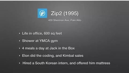 Musk 從默默無(wú)聞到聲名鵲起,是從和他一起來(lái)到美國(guó)的兄弟 Kimbal 合作開(kāi)始的。他們一起開(kāi)了第一家網(wǎng)絡(luò)公司 Zip2,一個(gè)幫助傳統(tǒng)媒體把內(nèi)容和信息發(fā)布到互聯(lián)網(wǎng)上的平臺(tái),其中包含黃頁(yè)和白頁(yè)功能,目標(biāo)是幫助全國(guó)性的網(wǎng)絡(luò)媒體與地方商家合作,將產(chǎn)品地方化。因?yàn)轭A(yù)算很緊,Musk 和 Kimbal 及另一位朋友合租了一套公寓,就在公寓里辦公和睡覺(jué),需要洗澡就去教會(huì)。作為首席程序員,Musk 不分晝夜地坐在電腦前工作。