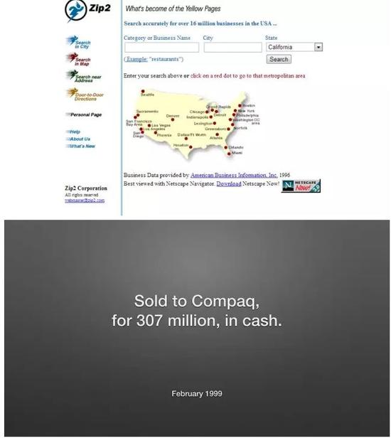 1999 年,康柏以 3.07 億美元收購(gòu)了 ZIP2,也讓當(dāng)時(shí)年僅 27 歲的 Musk 賺到了2200萬(wàn)美金。