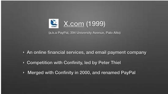 在 X.com 辦公的同一棟樓里,還有另一家叫 Confinity 的互聯(lián)網(wǎng)金融公司,創(chuàng)始人是如今大名鼎鼎的彼得·泰爾(Peter Thiel)和 Max Levchin。X.com 擁有快捷轉(zhuǎn)賬服務(wù),后來(lái) Confinity 也決定開(kāi)發(fā)類(lèi)似服務(wù)。兩家公司都開(kāi)始注意到快捷轉(zhuǎn)賬服務(wù)的市場(chǎng)需求很大,這也使兩家公司之間的競(jìng)爭(zhēng)愈發(fā)激烈,最終他們決定合并成一個(gè)公司,就是我們今天所熟知的 PayPal。