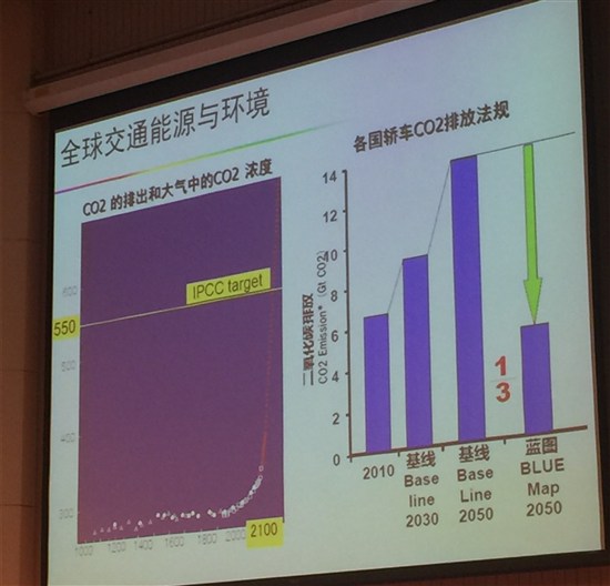 前陣子,長(zhǎng)安的徐留平董事長(zhǎng)我們交流了半天時(shí)間,我沒(méi)想用這張PPT,他居然提到了碳排放這個(gè)問(wèn)題,今天大家一看都是產(chǎn)業(yè)界的,在座的大部分是做管理相關(guān)的,不是做技術(shù)的,相信大家會(huì)關(guān)注這個(gè)問(wèn)題。二氧化碳在大氣中的濃度,IPCC(政府間氣候變化專門委員會(huì))的目標(biāo)是550個(gè)PPM,中國(guó)在巴黎峰會(huì)已經(jīng)非常積極地促成了巴黎峰會(huì)協(xié)議的達(dá)成。2050年我們減排2/3,這個(gè)目標(biāo)是非常艱巨的。