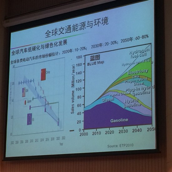 這是全球的環(huán)境,三種燃料中常規(guī)的石油燃料、氫、電三種動(dòng)力適用于三種范圍。行駛里程相對(duì)短、相對(duì)小的范圍中,電動(dòng)占優(yōu)勢(shì);中間混合動(dòng)力、插電式混合動(dòng)力相對(duì)占優(yōu);在大型車長(zhǎng)距離行駛中,能量消耗特別大的,可能是燃料電池、氫燃料電池會(huì)占優(yōu)勢(shì),這部分以前是柴油機(jī)作為動(dòng)力的范圍。這是一個(gè)總的情況。
