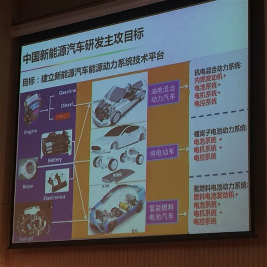 我們中國融入世界新能源汽車發(fā)展主流中創(chuàng)造適應(yīng)中國交通體系的純電驅(qū)動技術(shù)特色的優(yōu)勢是什么,我們把它分成三個區(qū)域。第一個區(qū)域就是形成小型電動車的特色,作為國民車;第二個區(qū)域,形成全電型插電式汽車,在有電的時候發(fā)動機是不工作的插電混合動力;第三個區(qū)域,形成電電混合的燃料電池特色,這是和豐田、本田不一樣的。他們的我們學(xué)不來,學(xué)了之后也沒法弄,我們走自己的路,這個就是戰(zhàn)略趨向。