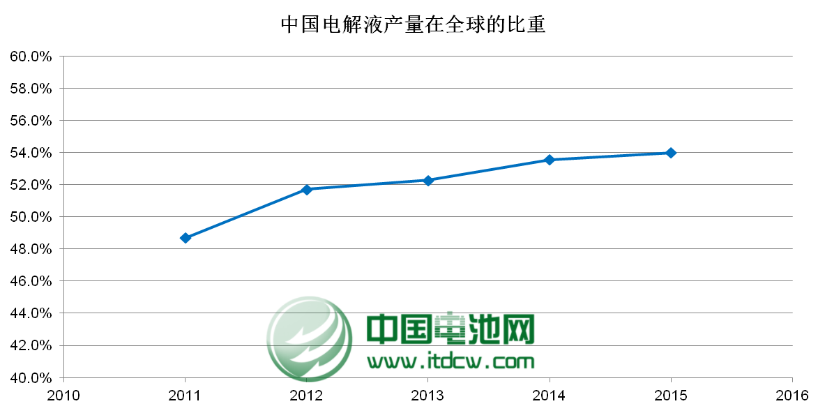 中國電解液產(chǎn)在全球的占比逐年增加,2012年首次過半,達到51.7%;2014年一部份電解液企業(yè)的擴產(chǎn)項目開始投入生產(chǎn)運營,預計當年產(chǎn)量占全球電解液產(chǎn)量的53.6%。