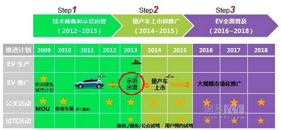 第一階段(2012-2013年):形成良好的技術(shù)儲備,與意向城市建立推廣合作關(guān)系開展示范運(yùn)營;第二階段(2014-2015年):量產(chǎn)車上市并展開市場推廣;第三階段(2016-2018年):批量生產(chǎn),規(guī)模推廣。