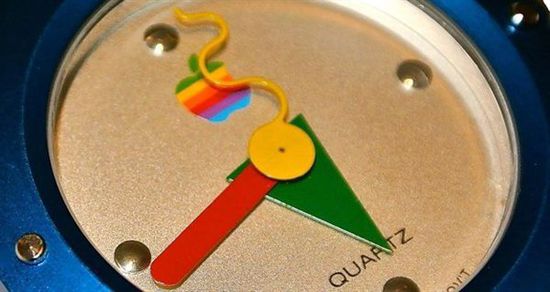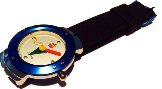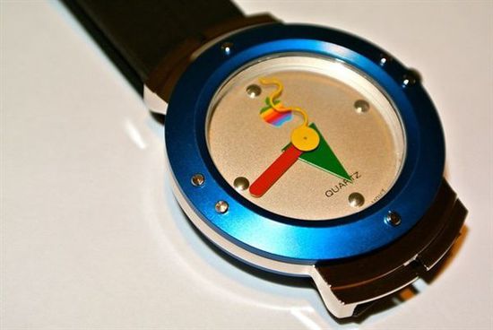 它是蘋果發布Macintosh7.5系統時隨之附贈的兩款贈品之一,表面醒目的logo還是那第一顆被咬掉的“蘋果”。指針、表盤、表圈的配色都取自logo,俏皮中不失協調。更為關鍵的是,“QUARTZ”的字樣告訴我們,這還是一款能換電池的石英表。