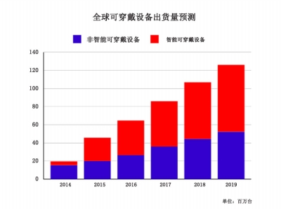 全球可穿戴設備2015年的出貨量將達到4570萬,而2019年的出貨量將達到1.261億,這意味著大約45%的年增長率。