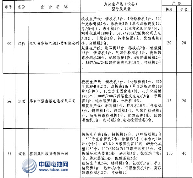 中國電池雜志-中國電池網9月17日訊(肖何 北京報道)工信部網站發布2013年第46號公告2013年第三批工業行業淘汰落后產能企業名單,鉛蓄電池行業有11家赫然上榜,分別是張家口保勝新能源科技有限公司、宿遷博遠電源科技有限公司、宿遷雷克電源有限公司、江蘇永達電源股份有限公司、天能電池集團有限公司、紹興白天鵝電動自行車有限公司、泗縣惠豐電源有限公司、江西省華輝電源科技有限公司、萍鄉市強鑫蓄電池有限公司、駱駝集團股份有限公司、福建省閩華電源股份有限公司(安溪縣),其中極板生產線(設備)629條,組裝生產線(設備)311條。