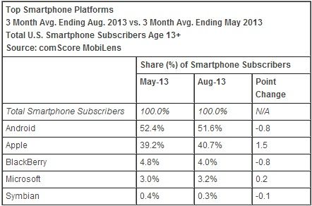 截止8月的上季度,蘋果智能手機市場份額增長1.5%,三星增長1.3%。HTC下跌1.3%,摩托羅拉下跌0.9%,而LG則與上季度前持平為6.7%。