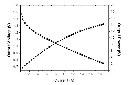 中國科學院寧波材料技術與工程研究所動力鋰電池工程實驗室在優化陰極空氣擴散電極的結構與制備工藝,以及開發高性能的錳氧化物氧還原催化劑的基礎上,成功研制出1000Wh鎂空氣電池樣機,詳見圖1所示。該電池由5個單體電池串聯而成,以AZ31鎂合金為陽極,以10%的NaCl溶液為電解液,以上述空氣擴散電極和錳氧化物催化劑為陰極。該鎂空氣電池的外觀尺寸為200×150×150 mm3,重量為2.3 kg,能量密度可達430 Wh/kg,最大輸出功率可達80W,其單體電池的I-V曲線如圖2所示。上述鎂空氣電池具有較好的商業化前景,可應用為野外供電電源、移動電源、備用電源和應急電源等。