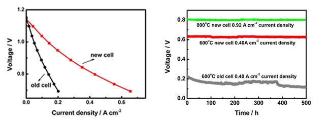 該團(tuán)隊(duì)研制出了LSM-YSZ微納陰極電池,電池輸出性能是傳統(tǒng)LSM-YSZ陰極電池的2至3倍,并且在600oC至800oC下運(yùn)行穩(wěn)定。在LSM-YSZ微納陰極中,納米級(jí)LSM顆粒和YSZ顆粒的緊密接觸增加了三相反應(yīng)界面密度,大幅度地提高了陰極的氧還原活性。同時(shí),納米級(jí)LSM顆粒與納米級(jí)YSZ顆粒的界面穩(wěn)定提高了陰極在運(yùn)行條件下的穩(wěn)定性。
