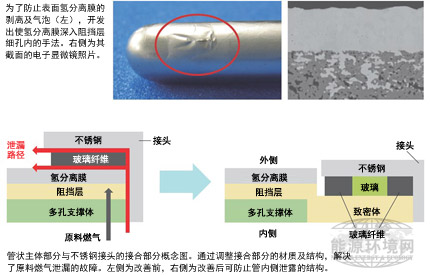其中之一就是氫分離膜的氣泡及剝離(上圖照片)。為了解決這個問題,研發人員提高了氫分離膜與多孔陶瓷支撐體的粘著力。具體而言,就是擴大多孔陶瓷表面的細孔等,使電鍍于表面的氫分離膜深入細孔內。這樣一來,膜的粘著力得到提高,氣泡及剝離問題得到解決。