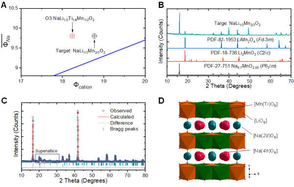 圖2.根據(jù)陽(yáng)離子勢(shì)設(shè)計(jì)富鈉O3材料。(A)Na-Li-Mn(Ti)-O的陽(yáng)離子勢(shì)分析;(B)初始組成Na[Li1/3Mn2/3]O2的XRD圖譜和相關(guān)標(biāo)準(zhǔn)圖譜;(C)O3-Na[Li1/3Ti1/6Mn1/2]O2的結(jié)構(gòu)精修XRD圖譜;(D)[Li1/3Ti1/6Mn1/2]O2層中Li/Mn(Ti)有序排布的結(jié)構(gòu)示意圖