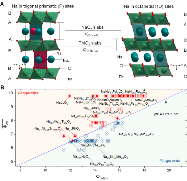 圖1.陽(yáng)離子勢(shì)及其在鈉離子層狀氧化物中的應(yīng)用。(A)典型P2型和O3型鈉離子層狀氧化物晶體結(jié)構(gòu)示意圖;(B)具有不同鈉含量、不同過(guò)渡金屬氧化態(tài)和組成的P2型和O3型鈉離子層狀氧化物在以陽(yáng)離子勢(shì)Φcation為橫坐標(biāo),鈉的加權(quán)平均離子勢(shì)