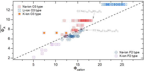 圖4.總結(jié)已報(bào)道的Li-/Na-/K堿金屬層狀氧化物的陽(yáng)離子勢(shì)相圖