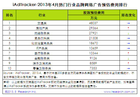 iResearch艾瑞咨詢根據網絡廣告監測系統iAdTracker的最新數據研究發現,2013年4月,交通類投放費用達4.8億元,位居第一;房地產類投放費用達2.9億元,位居第二;網絡服務類投放費用達2.8億元,位居第三。