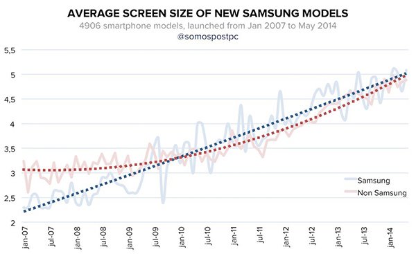 運營商推廣可以降低購買成本,對高端智能手機的銷售至關重要。以當時的市場環境,三星只要有中規中矩的產品便能成功。而三星不只是中規中矩而已,特別是對消費趨勢的把握上,三星2011年推出的Galaxy Note系列引領著手機屏幕越來越大的趨勢: