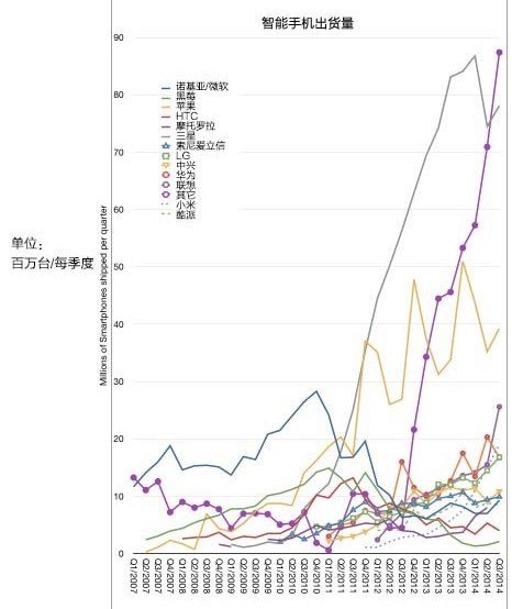 在三星轉而下滑的同時,小米、聯想、華為等中國手機廠商依然維持著高速增長。特別是小米,它的增長速度就像2010年的三星一樣驚人。
