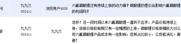 周三九九久(002411)在全景網(wǎng)互動(dòng)平臺(tái)上表示,近一段時(shí)間以來六氟磷酸鋰一直供不應(yīng)求,產(chǎn)品價(jià)格持續(xù)上漲,目前價(jià)格較前期又有一定幅度的上漲。碳酸鋰價(jià)格漲幅較大對(duì)公司六氟磷酸鋰產(chǎn)品成本有一定影響,但其占比較小,公司能消化。