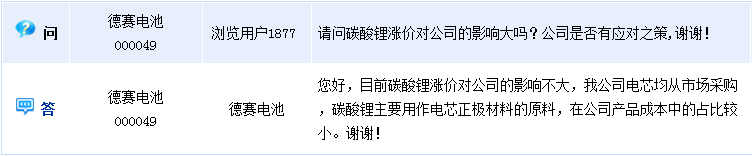 1月13日訊  德賽電池(000049)周二晚間在全景網互動平臺上回答投資者提問時表示,目前碳酸鋰漲價對公司的影響不大。
