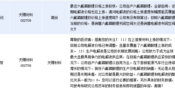 天賜材料(002709)周三晚間在全景網(wǎng)互動(dòng)平臺(tái)上表示,在上游原材料上漲的情況下,目前公司電解液價(jià)格已有調(diào)整,且基本覆蓋了六氟磷酸鋰上漲的成本。