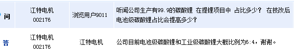 江特電機(jī)(002176)周四在全景網(wǎng)互動(dòng)平臺(tái)表示,公司目前電池級(jí)碳酸鋰和工業(yè)級(jí)碳酸鋰大概比例為6:4。