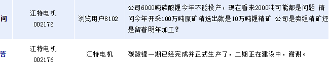 江特電機(jī)還表示,碳酸鋰一期已經(jīng)完成并正式生產(chǎn)了,二期正在建設(shè)中。