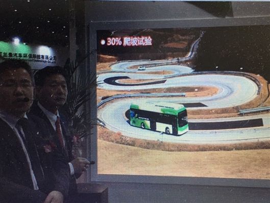 記者在現場看到:從正在放映的電視中記者看到更為驚險、精彩的畫面:只見一臺大客車固定在側翻試驗臺上,隨著側翻角度加大,隨著一聲轟鳴整車隨即側翻在地面,只見所有玻璃破碎,然而車身未見任何扭曲、撕裂及變形,特別是裝在該車頂部200kWh近兩噸重的電池及箱體不僅完好無損,仍牢牢固定在車頂頂部,在場所有人員發出驚嘆的呼聲。而在現場一位工作人員正輪著大錘猛砸一塊制造電動客車的車身的材料,砸后沒有變形破裂。