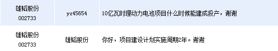雄韜股份(002733)周二在全景網互動平臺上表示,10億瓦時鋰動力電池項目建設計劃實施周期為2年。