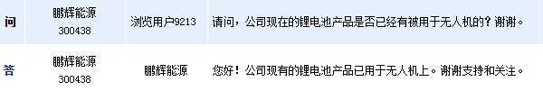 鵬輝能源(300438)周一在全景網(wǎng)互動(dòng)平臺(tái)表示,公司現(xiàn)有的鋰電池產(chǎn)品已用于無人機(jī)上。
