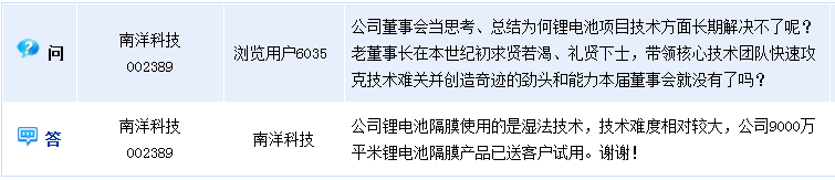 南洋科技周二在全景網互動平臺上回答投資者提問時表示,公司鋰電池隔膜使用的是濕法技術,技術難度相對較大;公司9000萬平米鋰電池隔膜產品已送客戶試用。