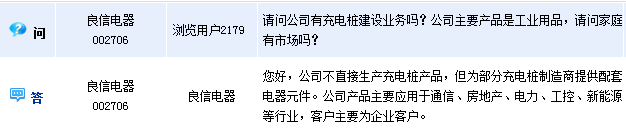 良信電器(002706)周三在全景網互動平臺上表示,公司不直接生產充電樁產品,但為部分充電樁制造商提供配套電器元件。