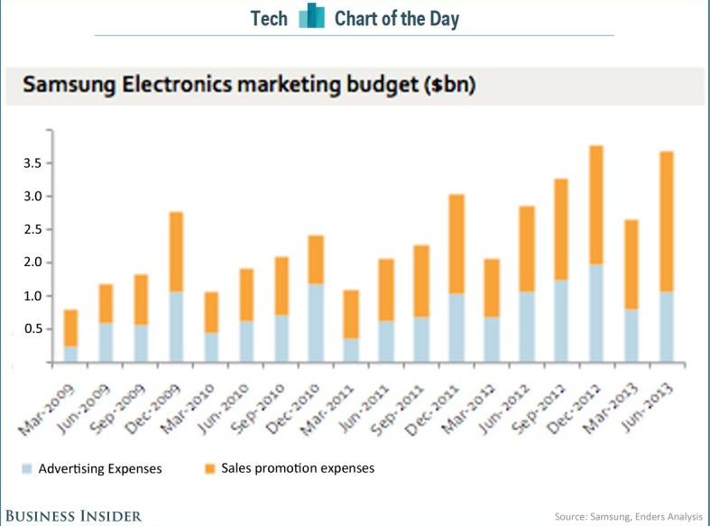 毫無疑問,三星在市場推廣方面近乎瘋狂的投入,無人能及。不過,Evans綜合以往的經(jīng)驗(yàn)指出,三星今年第四季度的市場推廣預(yù)算將為45億美金。