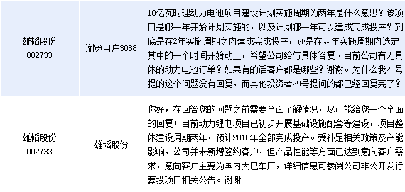雄韜股份周二在全景網互動平臺上表示,目前動力鋰電項目已初步開展基礎設施配套等建設,項目整體建設周期兩年,預計2018年全部完成投產。