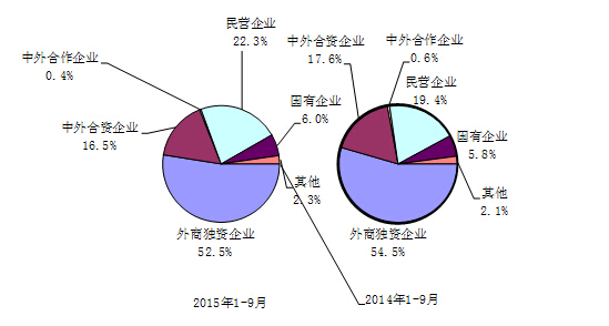 2015年1-9月,內(nèi)資企業(yè)出口1700億美元,同比增長(zhǎng)11.3%。其中,民營(yíng)企業(yè)出口1240億美元,同比增長(zhǎng)14.1%;國(guó)有企業(yè)出口333億美元,同比增長(zhǎng)2.3%;集體企業(yè)出口126億美元,同比增長(zhǎng)10.3%。三資企業(yè)出口3856億美元,同比下降5.1%。其中,外商獨(dú)資企業(yè)出口2918億美元,同比下降4.1%;中外合資企業(yè)出口914億美元,同比下降7.1%;中外合作企業(yè)出口24億美元,同比下降31.9%。