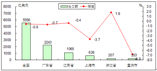 出口方面,排名前五位的省市分別是:廣東省(2243億美元、-0.7%)、江蘇省(1065億美元、-0.4%)、上海市(638億美元、-3.7%)、浙江省(207億美元、1.8%)和重慶市(203億美元、-6.8%)。中西部地區(qū)的貴州、青海、湖南等省份出口增長(zhǎng)較快增速,均超過(guò)100%。