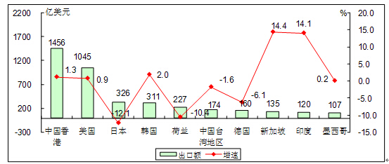 對(duì)新加坡和印度出口增長(zhǎng)較快,增速分別為14.4%和14.1%。對(duì)香港、美國(guó)、韓國(guó)小幅增長(zhǎng),增速分別為1.3%、0.9%、2.0%,出口額分別為1456億美元、1045億美元、311億美元。對(duì)日本、荷蘭、歐洲出口下降較為明顯,降速分別為12.1%、10.4%和8.1%。