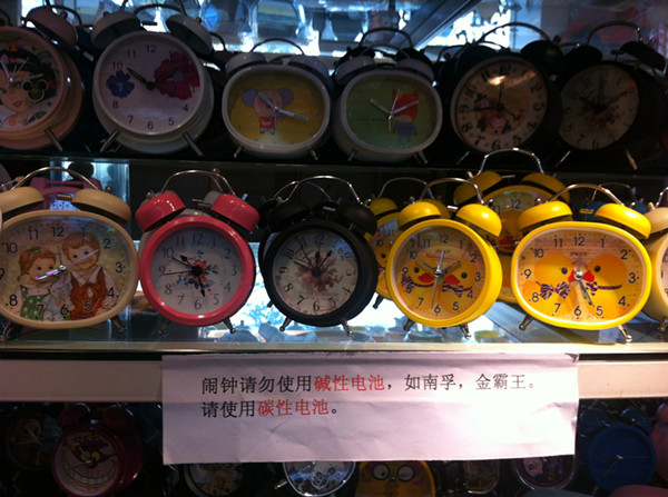 今天(1月1日),記者在干將路一家精品店購買鬧鐘時,看到擺放鬧鐘的柜臺上貼著一張醒目的紙條“鬧鐘請勿使用堿性電池,如南孚、金霸王。請使用碳性電池。”看到記者一副糾結的樣子,店里的工作人員主動解釋:其實鬧鐘對電池的要求并不高,電流也很低,使用低流量的碳性電池即可。