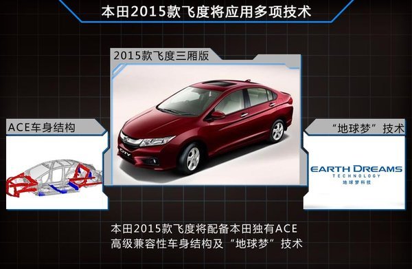 在2014年底特律車展上,本田也發布了全新飛度車型,新車將配備本田獨有的ACE高級兼容性車身結構,這是本田引以為傲的G-CON技術上革新發展而來 的新一代車身技術。能使車輛在發生碰撞的時候能夠充分吸收撞擊的能量,保持車輛的安全性能。動力方面,全新飛度將應用“地球夢”科技,并搭載汽油發動機和 混動版多種動力系統,進一步提升燃油經濟性。