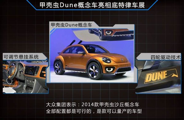 大眾在底特律車展亮相了甲殼蟲Dune(沙丘)第二代概念車,新車除外觀更越野外,對內飾也進行了升級,并標注了“Dune”的醒目標識。新車還采用了可 調節式懸掛系統,以應對各種路面情況。動力方面,新車將會搭載一臺最大功率為155KW的2.0L渦輪增壓發動機,與之匹配的是DSG六擋雙離合變速箱, 其有望在2015年推出量產版本。