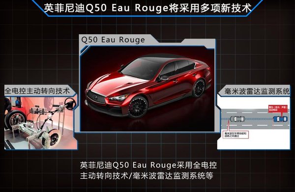 英菲尼迪Q50 Eau Rouge搭載了全電控主動轉向技術、毫米波雷達監測系統等多項駕駛輔助系統。英菲尼迪全球執行設計總監阿方索先生表示:“性能是英菲尼迪基因中的重要支 柱,Q50 Eau Rouge在設計上表達了對這一理念更加深入的詮釋。另外,英菲尼迪Q50匯聚了大量科技,為高性能版本提供了絕佳的基礎?!贝送?,新車還采用了全新 Infiniti InTouchTM人機交互系統,并應用首創的雙觸屏設計并支持多點觸控,將傳統的信息顯示和功能操作兩大功能區分開,實現更為可靠的駕駛。