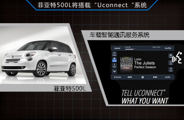 菲亞特-克萊斯勒全新的車載智能通訊服務系統,也稱為“Uconnect”。這套系統在2013年美國CES消費類電子展上也曾出現,Uconnect娛樂信息系統能支持收音機、多媒體、導航、電話和App,甚至連座椅加熱和空調恒溫都可以通過這個系統來調節。此外,2014款菲亞特500L等車型均有望采用,消費者在購買時候可選裝Uconnect娛樂信息系統,安裝成功就可以激活這些功能。