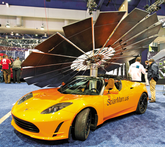 特斯拉電動汽車上裝著巨大的太陽能板 本版圖/新華社