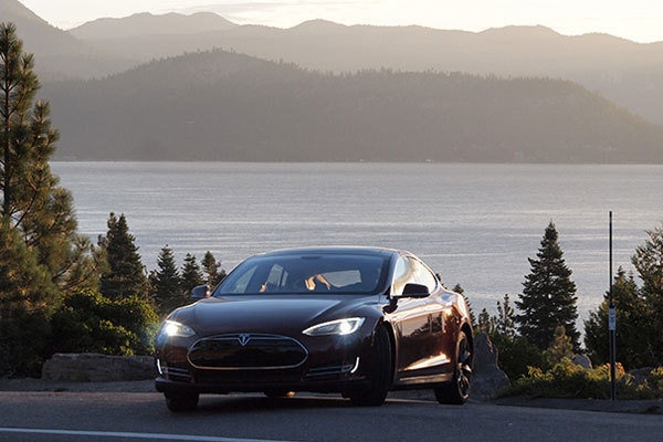 7.剛剛在特斯拉充電樁完成充電的汽車在加州附近的太浩湖即將開始530英里的旅程。