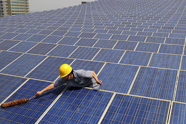 一名工人正在清潔房頂上的太陽能板。天臺太陽能板的鋪設增加了消防救援的難度。(路透社) 目前屋頂上安裝的太陽能電池板已經在全美得到普遍推廣,但據《基督教箴言報》報道,這種做