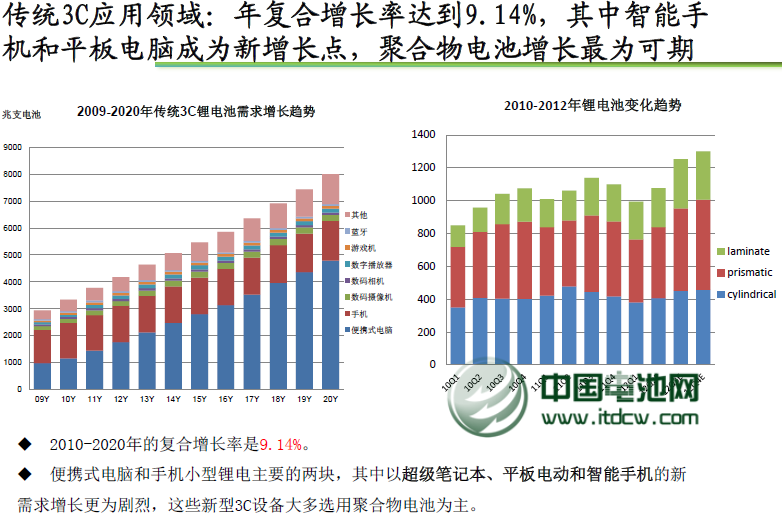 2010-2020年的復合增長率是9.14%。便攜式電腦和手機小型鋰電主要的兩塊,其中以超級筆記本、平板電動和智能手機的新需求增長更為劇烈,這些新型3C設備大多選用聚合物電池為主。