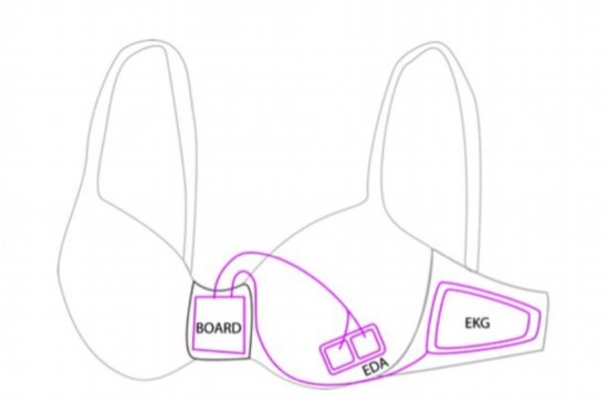 這款智能文胸由電池供電,在罩杯和側邊處配備傳感器,可檢測佩戴者的心臟速率、體溫變化和呼吸模式,從而反映佩戴者的壓力水平。當其壓力水平過高時,文胸會通過藍牙向佩戴者手機發送警告,以使其遠離高熱量食品。