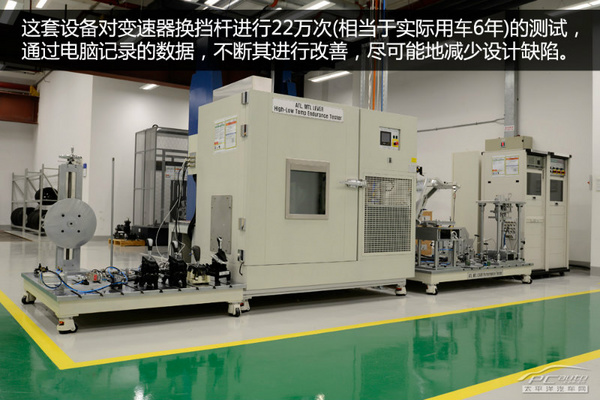 工程人員介紹,通過這套設備對變速器換擋桿進行了22萬次(相當于實際用車6年)的測試,通過電腦記錄的數據,不斷其進行改善,盡可能地減少設計缺陷。一輛車從設計到量產到用戶手中,都必須經過各種測試和改進,才能保障車的使用可靠性,而這些擁有先進設備的實驗室提供了很好的基礎。