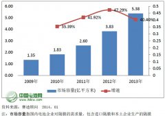 2013年,中國國內鋰電隔膜的市場容量為5.38億平方米,同比增長40.40%,市場規模達到50.32億元,同比增長20.52%;2013年全球隔膜產量達到8.37億平方米,較2012年增長27.98%。...